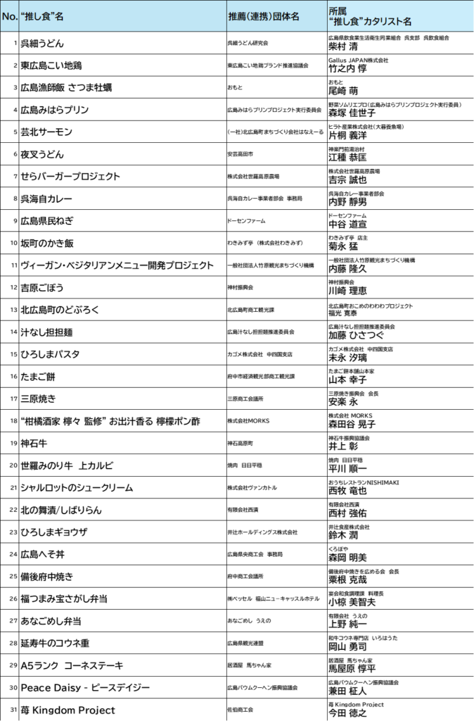 Out of the 31 entries, the five groups that advanced to the final round, based on over 60,000 votes from the prefectural residents and the judges' evaluation, are "Higashihiroshima Koi Chicken," "Geihoku Salmon," "Yasha Udon," "Hiroshima Pasta," and "Lemon Ponzu"!